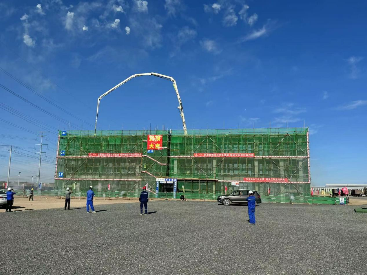 此次封頂?shù)?#標準化廠房,長49.45米,寬108米,高13.45米,建筑面積11193平方米,其中主廠房為2層鋼結(jié)構(gòu),一層高為6.3米,二層高為7.15米。輔助用房為3層混凝土框架結(jié)構(gòu),一層高為4.45米,二 層高為4.42米,三層高為4.8米。2#標準化廠房輔助用房7月11日一層澆筑完成,7月19日二層澆筑完成,7月29日喜封金頂。