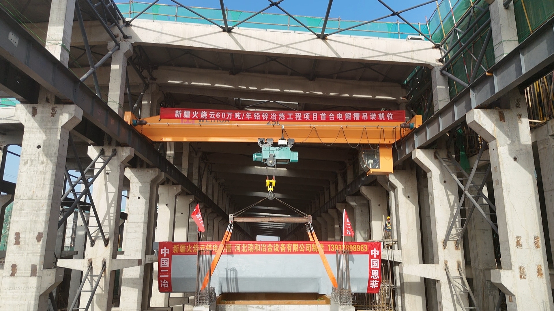 9月24日,冶金分公司新疆火燒云鉛鋅礦60萬噸/年鉛鋅冶煉工程項目迎來了重要節(jié)點(diǎn),施工現(xiàn)場首臺電解槽順利吊裝就位,標(biāo)志著項目建設(shè)取得突破性進(jìn)展,電解車間正式進(jìn)入設(shè)備安裝階段。