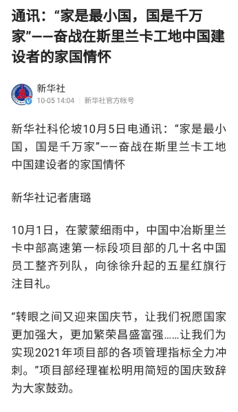 10月5日,新華社以《“家是最小國,國是千萬家”——奮戰(zhàn)在斯里蘭卡工地中國建設(shè)者的家國情懷》為題對(duì)中國中冶斯里蘭卡中部高速第一標(biāo)段項(xiàng)目部進(jìn)行特別報(bào)道。項(xiàng)目工作人員在采訪中表示,“家是最小國,國是千萬家”,作為在海外參與“一帶一路”項(xiàng)目的建設(shè)者,我們懷有一種使命感和責(zé)任感,盡管有時(shí)需要為此作出個(gè)人犧牲。當(dāng)看到通過自己的努力,斯里蘭卡基礎(chǔ)設(shè)施日新月異、旅游業(yè)蓬勃發(fā)展,我們感到由衷高興和自豪。
