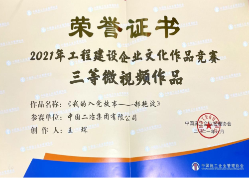 會上公布了2021年工程建設(shè)企業(yè)文化作品競賽活動評選結(jié)果及2021年度優(yōu)秀通訊員名單。中國二冶官網(wǎng)榮獲工程建設(shè)企業(yè)文化作品競賽優(yōu)秀網(wǎng)站;公司黨群工作部王延祥、王志義、于超群主創(chuàng)的《光榮與夢想》榮獲微視頻作品類一等獎;路橋分公司王琛主創(chuàng)的《我的入黨故事——郝艷波》榮獲微視頻作品類三等獎;公司黨群工作部張婷榮獲2021年度優(yōu)秀通訊員。