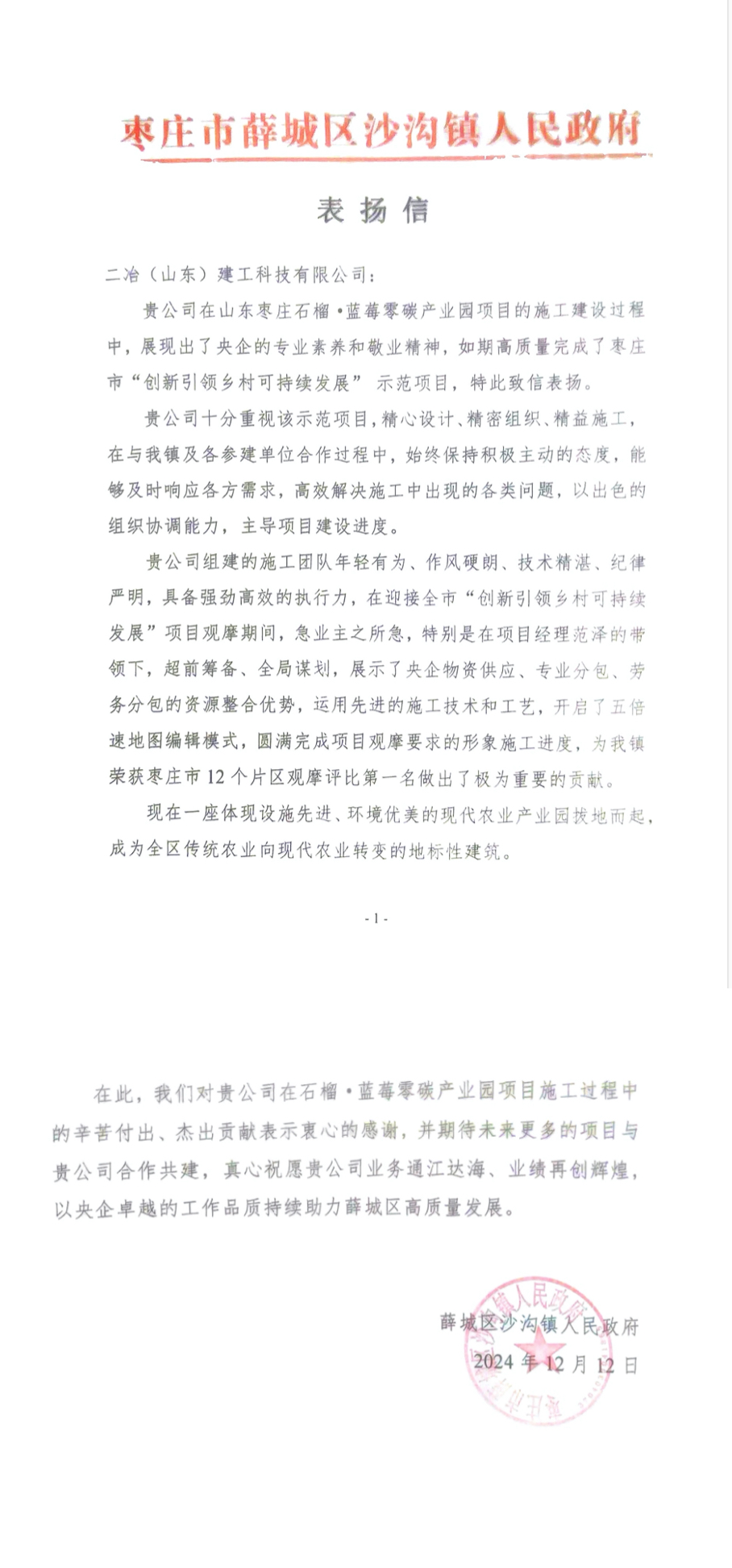 棗莊市薛城區(qū)沙溝鎮(zhèn)人民政府來信對二冶(山東)建工在棗莊石榴·藍(lán)莓零碳產(chǎn)業(yè)園項(xiàng)目施工中展現(xiàn)出的央企專業(yè)素養(yǎng)和敬業(yè)精神表示肯定,對項(xiàng)目在棗莊市12個(gè)片區(qū)觀摩評比中助力沙溝鎮(zhèn)榮獲第一名所作出的重要貢獻(xiàn)表示由衷感謝,對今后的合作共建寄予期望。棗莊石榴·藍(lán)莓零碳產(chǎn)業(yè)園項(xiàng)目作為推行國家鄉(xiāng)村振興戰(zhàn)略、國家數(shù)字化農(nóng)業(yè)戰(zhàn)略、綠色農(nóng)業(yè)、“雙碳” 戰(zhàn)略的示范項(xiàng)目,受到當(dāng)?shù)卣母叨戎匾?。?xiàng)目團(tuán)隊(duì)秉承中國二冶雷厲風(fēng)行、使命必達(dá)的工作作風(fēng),以強(qiáng)勁硬朗的執(zhí)行能力高質(zhì)高效推進(jìn)項(xiàng)目建設(shè)進(jìn)度,為地方鄉(xiāng)村振興奉獻(xiàn)了央企智慧和力量。