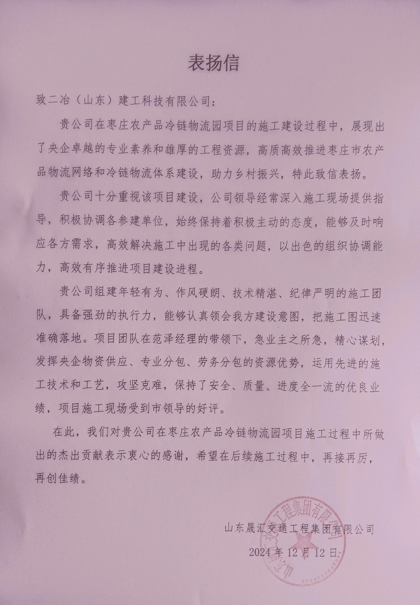 山東晟匯交通工程集團(tuán)有限公司來信表揚(yáng)二冶(山東)建工在棗莊農(nóng)產(chǎn)品冷鏈物流園項(xiàng)目建設(shè)中展現(xiàn)出的央企卓越專業(yè)素養(yǎng)和雄厚工程資源。棗莊農(nóng)產(chǎn)品冷鏈物流園項(xiàng)目是山東省物流發(fā)展戰(zhàn)略重點(diǎn)規(guī)劃建設(shè)項(xiàng)目之一,是棗莊市農(nóng)產(chǎn)品物流網(wǎng)絡(luò)和冷鏈物流體系建設(shè)重點(diǎn)項(xiàng)目,工期緊、任務(wù)重,建設(shè)中,山東公司領(lǐng)導(dǎo)深入施工現(xiàn)場,協(xié)調(diào)參建各方,形成共識,協(xié)同一致高效推進(jìn)項(xiàng)目進(jìn)度。項(xiàng)目團(tuán)隊(duì)嚴(yán)格執(zhí)行公司指令,攻堅(jiān)克難,用強(qiáng)勁的執(zhí)行力確保項(xiàng)目高質(zhì)量落地。歷時(shí)100多天的項(xiàng)目攻堅(jiān)戰(zhàn),項(xiàng)目團(tuán)隊(duì)成員的專業(yè)技能在實(shí)踐歷練中升華,團(tuán)隊(duì)協(xié)作在施工現(xiàn)場磨合中趨于默契,一支敢打硬仗的青年突擊隊(duì)在公司的精心培育下茁壯成長。項(xiàng)目團(tuán)隊(duì)在施工現(xiàn)場展現(xiàn)的央企風(fēng)貌得到項(xiàng)目參建各方的高度認(rèn)可和尊重。