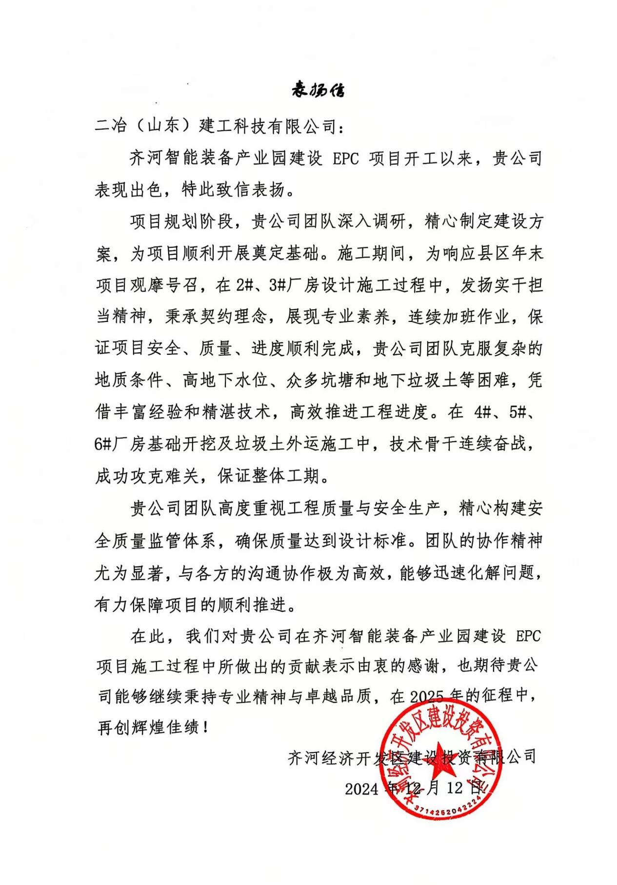 12月24日,中國二冶全資子公司二冶(山東)建工科技有限公司收到業(yè)主單位齊河縣經濟開發(fā)區(qū)建設投資有限公司的表揚信。信中對自齊河智能裝備產業(yè)園建設 EPC 項目開工以來的卓越表現(xiàn)給予了極高的贊譽。