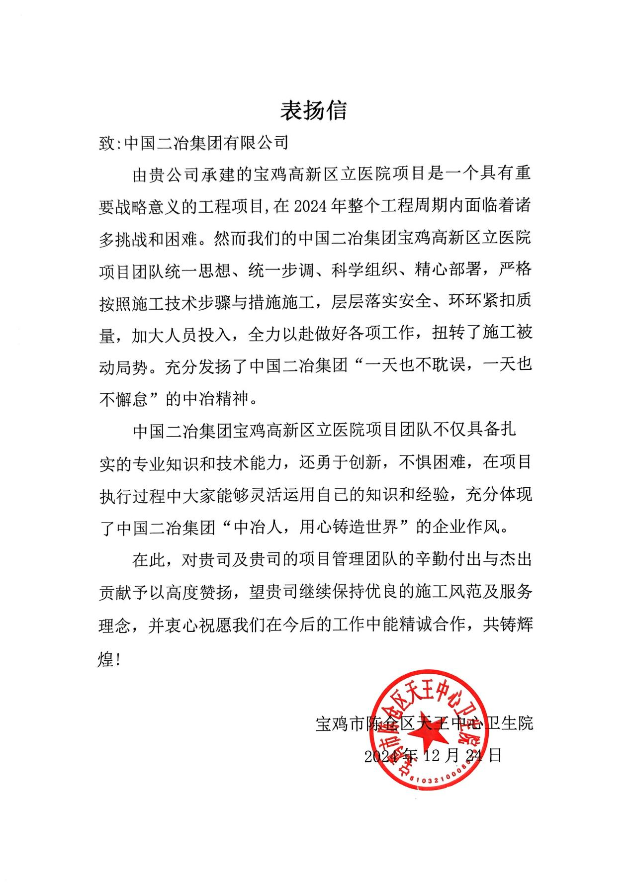 寶雞市陳倉區(qū)天王中心衛(wèi)生院來信對(duì)中國二冶寶雞高新區(qū)立醫(yī)院項(xiàng)目管理團(tuán)隊(duì)的辛勤付出與杰出貢獻(xiàn)予以高度贊揚(yáng)。在2024年建設(shè)過程中,項(xiàng)目面臨著諸多的困難和挑戰(zhàn),項(xiàng)目部全體人員統(tǒng)一思想、統(tǒng)一步調(diào)、科學(xué)組織、精心部署,層層落實(shí)安全、環(huán)環(huán)緊扣質(zhì)量、全力以赴做好項(xiàng)目建設(shè)各項(xiàng)工作,扭轉(zhuǎn)了施工被動(dòng)局勢(shì),項(xiàng)目團(tuán)隊(duì)不僅具備扎實(shí)的專業(yè)知識(shí)和技術(shù)能力,還勇于創(chuàng)新,不懼困難,充分體現(xiàn)了中國二冶“共建一流項(xiàng)目 合創(chuàng)品牌價(jià)值”的企業(yè)經(jīng)營理念。寶雞高新區(qū)立醫(yī)院項(xiàng)目是“十四五”期間寶雞市重點(diǎn)項(xiàng)目,是一所集醫(yī)療、教學(xué)、科研、預(yù)防、保健、康復(fù)于一體的綜合性三級(jí)甲等綜合醫(yī)院,建成后將提高寶雞市高新區(qū)區(qū)域衛(wèi)生服務(wù)水平,極大緩解寶雞市東部和南部區(qū)域醫(yī)療資源不足的局面。
