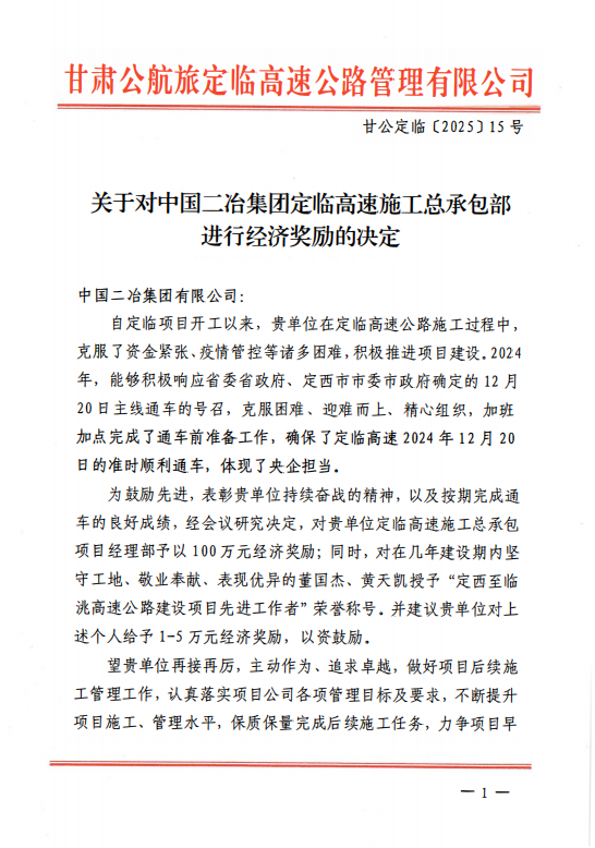 獎(jiǎng)勵(lì)決定指出:自定臨項(xiàng)目開工以來,中國二冶集團(tuán)項(xiàng)目管理團(tuán)隊(duì)克服了資金緊張、疫情管控等諸多困難,積極推進(jìn)項(xiàng)目建設(shè)。2024年,能夠積極響應(yīng)省委省政府、定西市委市政府確定的12月20日主線通車的號(hào)召,克服困難、迎難而上、精心組織,加班加點(diǎn)完成了通車前準(zhǔn)備工作,確保了定臨高速在2024年12月20日準(zhǔn)時(shí)順利通車,體現(xiàn)了央企擔(dān)當(dāng)。