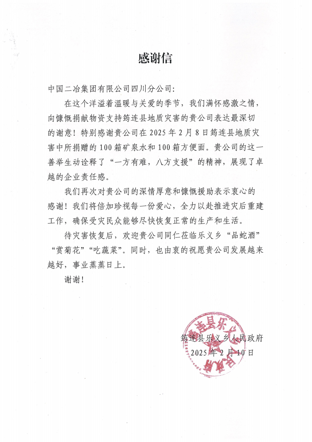 2月10日,中國二冶收到四川省宜賓市筠連縣樂義鄉(xiāng)人民政府感謝信,對中國二冶捐贈物資支持宜賓市筠連縣山體滑坡?lián)岆U救援工作表示敬意和感謝!
