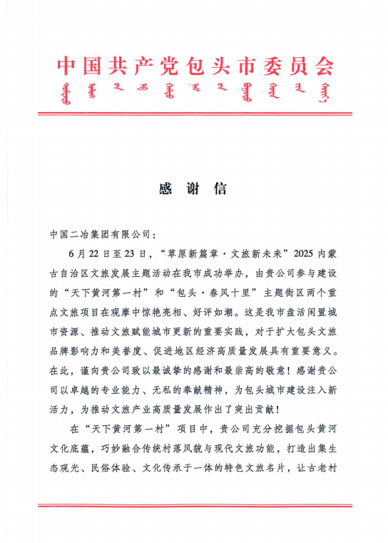 6月30日,中國二冶收到包頭市委、市政府發(fā)來的表揚(yáng)信,對中國二冶在“天下黃河第一村”和“包頭?春風(fēng)十里”兩大重點文旅項目建設(shè)中作出的卓越貢獻(xiàn),給予高度贊譽(yù)。?