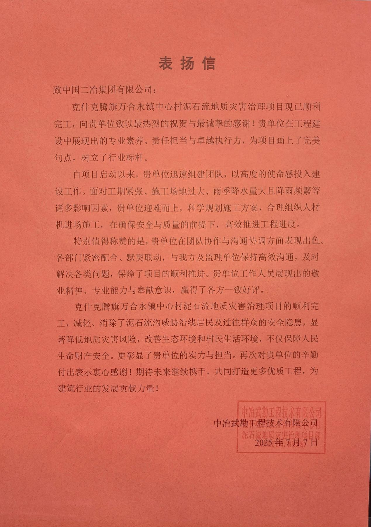 7月7日,中國(guó)二冶收到中冶武勘工程技術(shù)有限公司表?yè)P(yáng)信,表揚(yáng)中國(guó)二冶在克什克騰旗萬(wàn)合永鎮(zhèn)中心村泥石流地質(zhì)災(zāi)害治理項(xiàng)目建設(shè)中展現(xiàn)出的卓越專業(yè)素養(yǎng)、高度責(zé)任擔(dān)當(dāng)和強(qiáng)大執(zhí)行力,為項(xiàng)目的順利完工和取得顯著成效作出了重要貢獻(xiàn)。