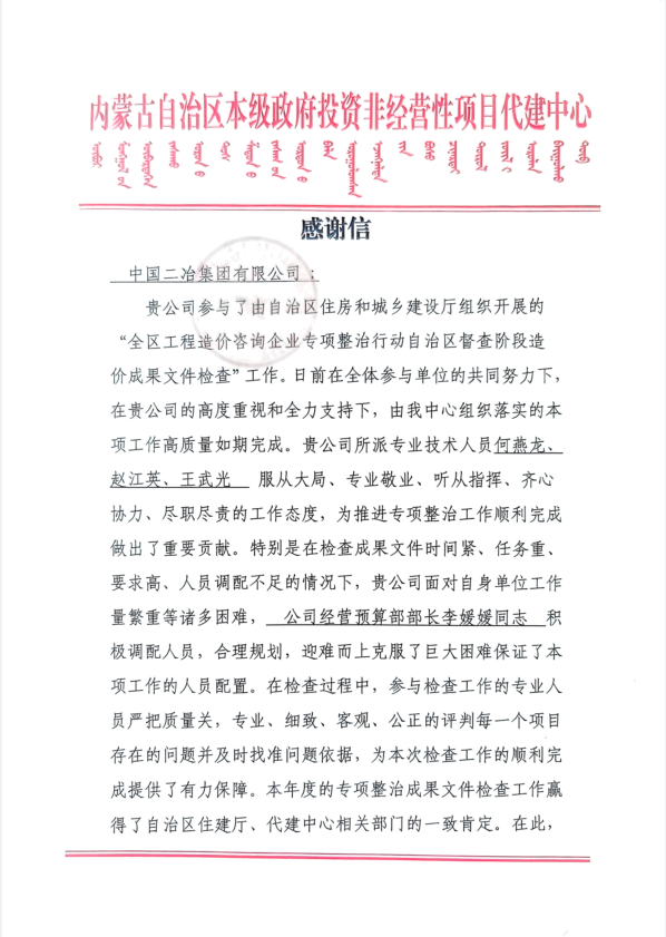 近日,中國二冶收到內(nèi)蒙古自治區(qū)本級(jí)政府投資非經(jīng)營性項(xiàng)目代建中心的感謝信,信中對(duì)公司在全區(qū)工程造價(jià)咨詢企業(yè)專項(xiàng)整治行動(dòng)中的突出表現(xiàn)給予高度肯定,彰顯了駐自治區(qū)建筑央企的專業(yè)實(shí)力與責(zé)任擔(dān)當(dāng)。