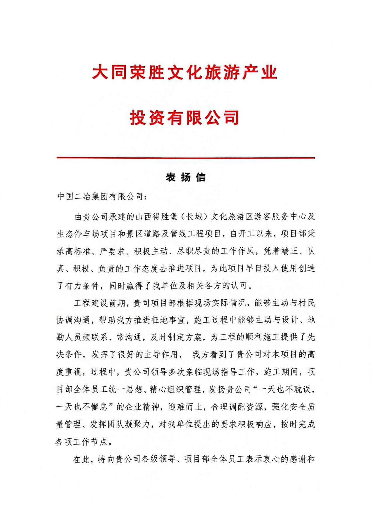 8月21日,中國(guó)二冶收到大同榮勝文化旅游產(chǎn)業(yè)投資有限公司發(fā)來(lái)的表?yè)P(yáng)信,信中對(duì)中國(guó)二冶內(nèi)蒙古分公司在項(xiàng)目建設(shè)中的卓越表現(xiàn)給予高度認(rèn)可。?
