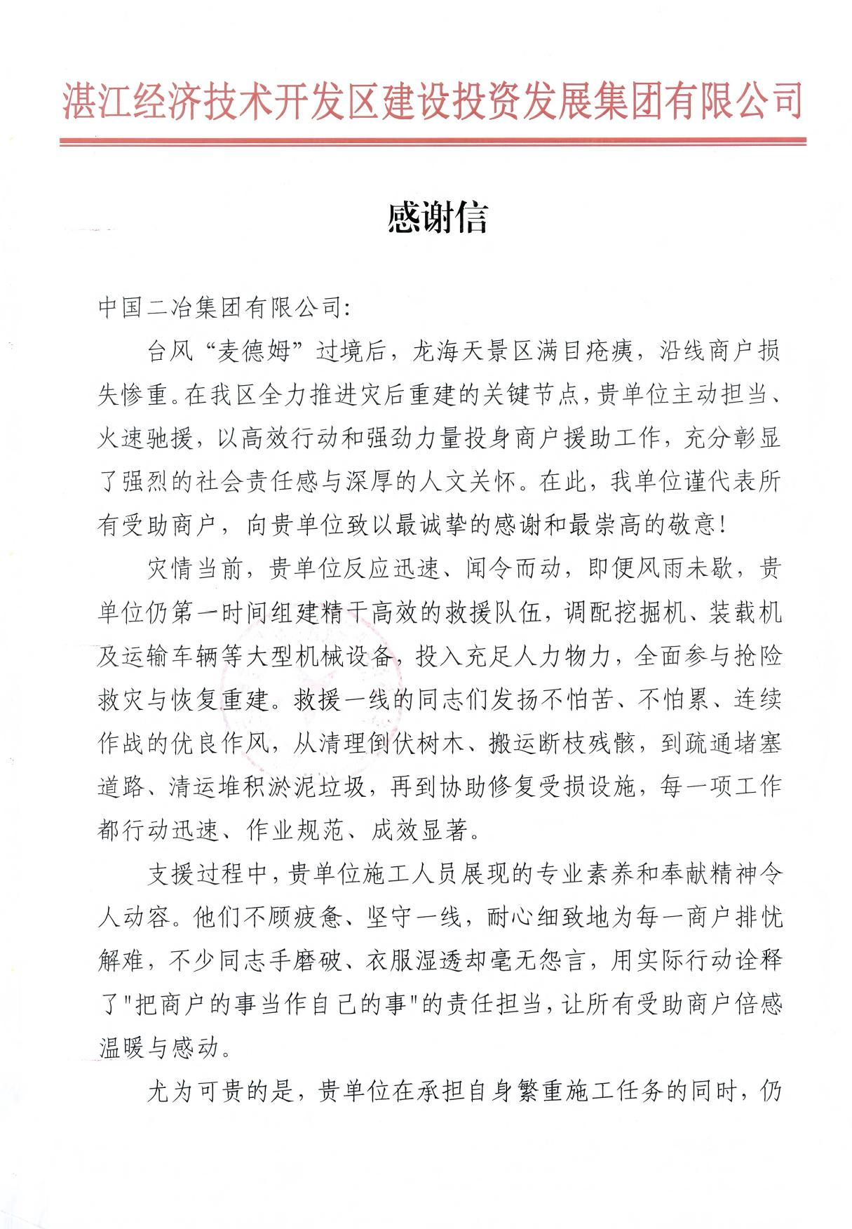 表揚(yáng)信指出,臺風(fēng)“麥德姆”給龍海天景區(qū)及沿線商戶造成嚴(yán)重?fù)p失,災(zāi)后重建工作迫在眉睫。關(guān)鍵時(shí)刻,中國二冶主動(dòng)請纓、迅速響應(yīng),在風(fēng)雨未歇之際組建精干救援隊(duì)伍,調(diào)配挖掘機(jī)、裝載機(jī)等大型機(jī)械設(shè)備,投入充足人力全力參與搶險(xiǎn)。救援人員發(fā)揚(yáng)連續(xù)作戰(zhàn)的優(yōu)良作風(fēng),高效開展倒伏樹木清理、斷枝搬運(yùn)、道路疏通、淤泥清運(yùn)及受損設(shè)施修復(fù)等工作,作業(yè)規(guī)范、成效顯著。施工人員不顧疲憊與辛勞,耐心為商戶排憂解難,部分人員手磨破、衣服濕透仍毫無怨言,用實(shí)際行動(dòng)詮釋了“把商戶的事當(dāng)作自己的事”的責(zé)任擔(dān)當(dāng),讓受助商戶倍感溫暖。表揚(yáng)信特別提到,中國二冶在承擔(dān)自身繁重施工任務(wù)的同時(shí),仍能高效有序推進(jìn)援助工作,充分展現(xiàn)了卓越的管理水平、強(qiáng)大的組織協(xié)調(diào)能力及過硬的應(yīng)急處置實(shí)力。